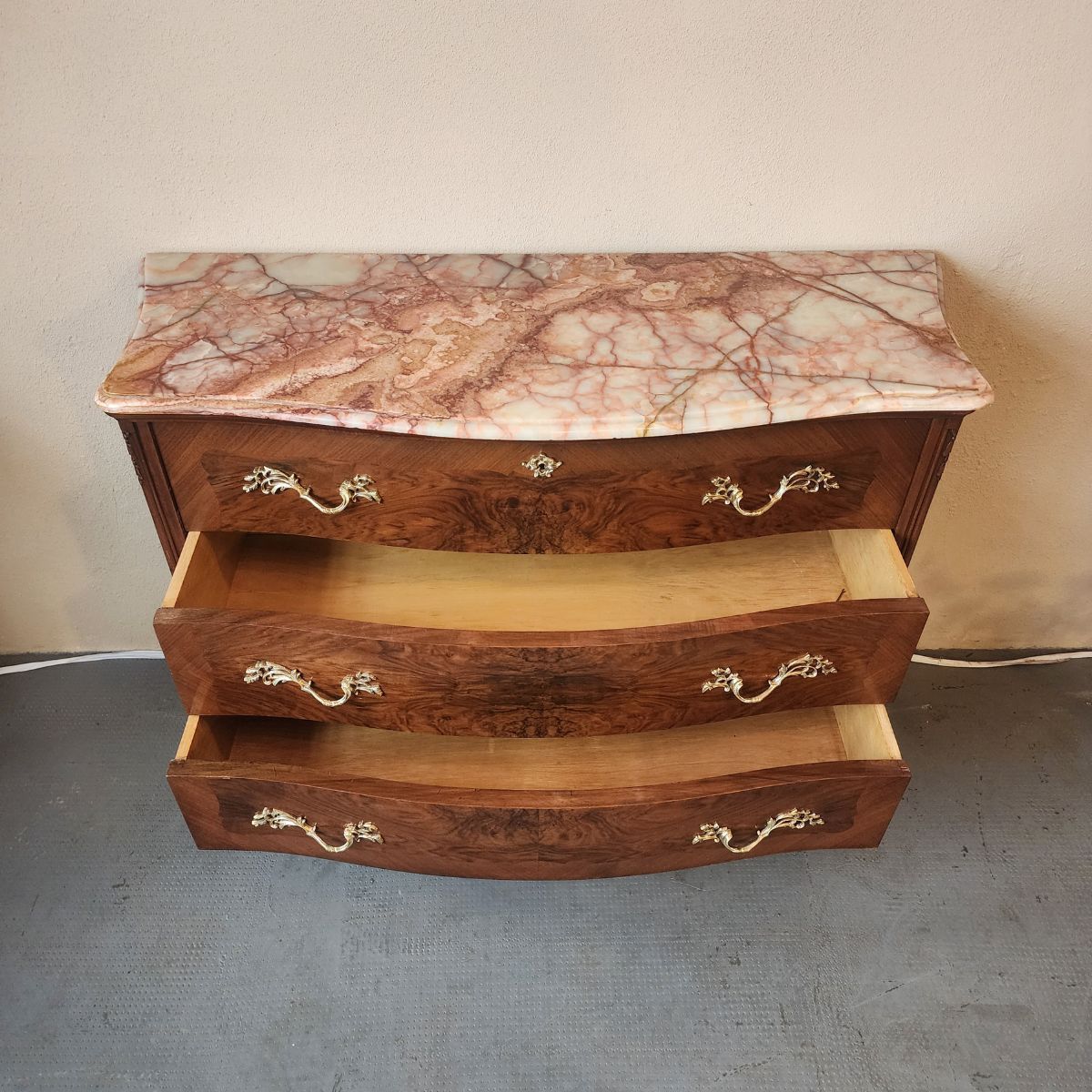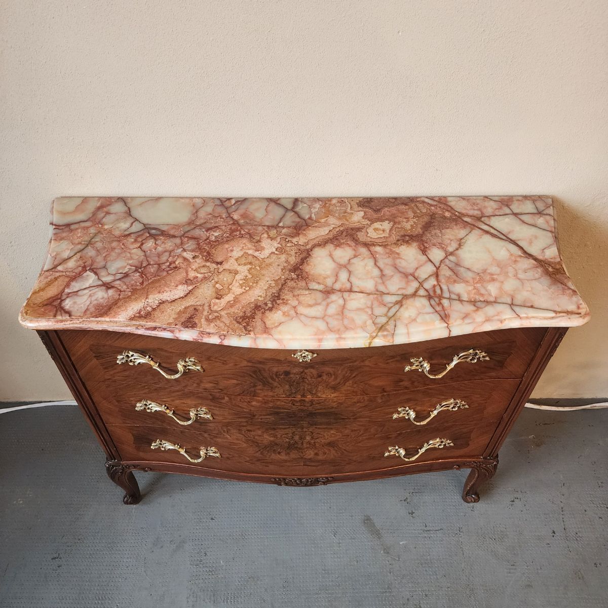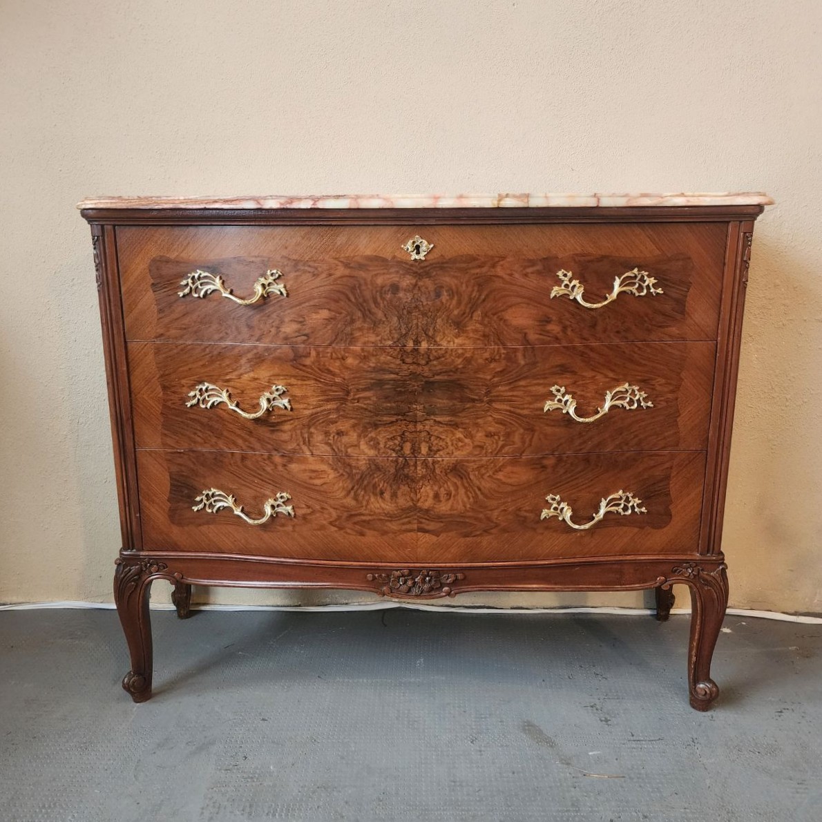 Elegante cómoda de estilo francés Luis XV, realizada en madera con enchapado y veta protagonista. Presenta tapa de mármol y un práctico secreter oculto con compartimentos interiores, ideal para organizar y sumar funcionalidad.