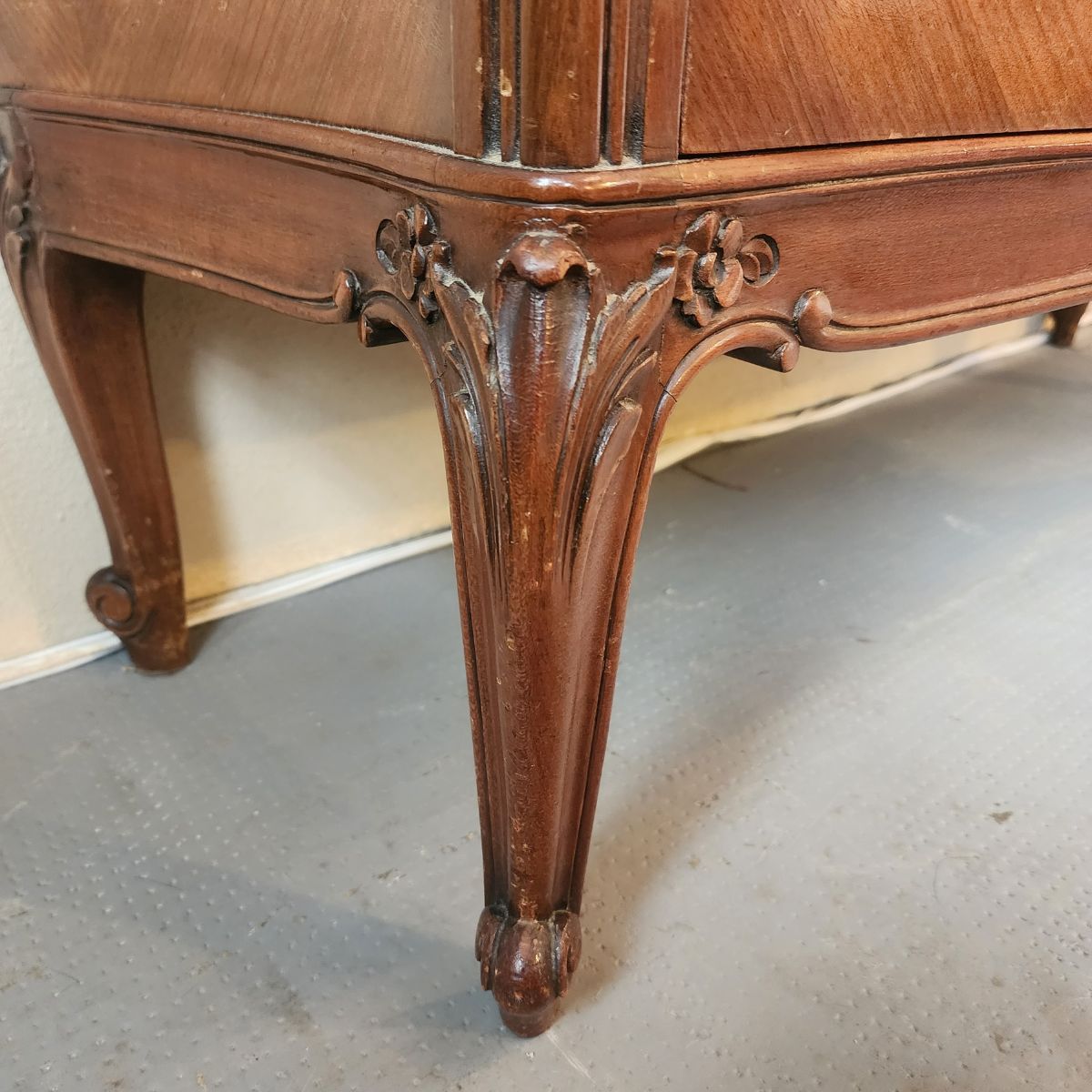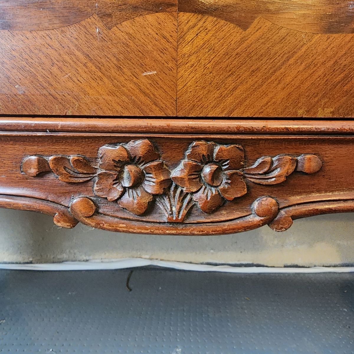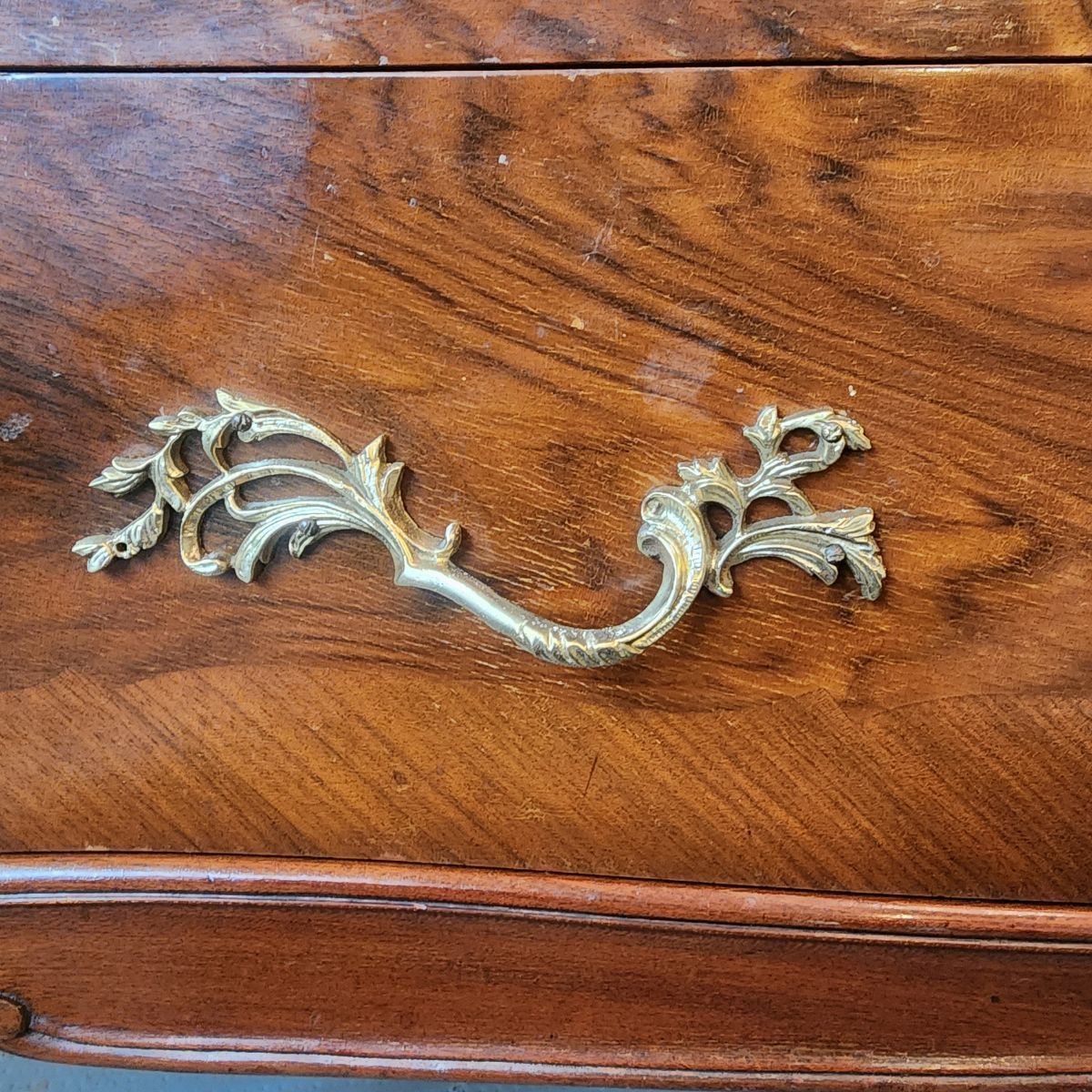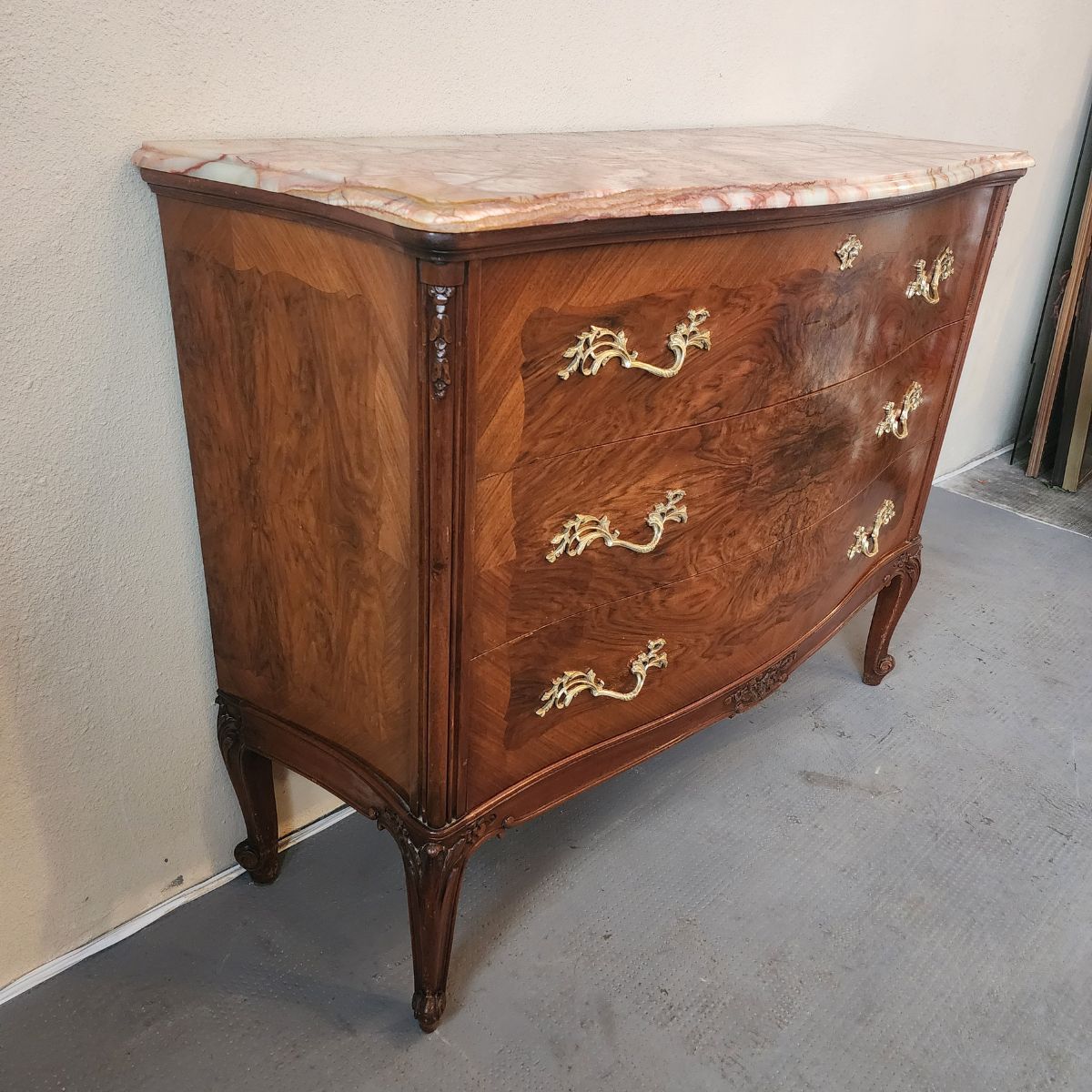 Elegante cómoda de estilo francés Luis XV, realizada en madera con enchapado y veta protagonista. Presenta tapa de mármol y un práctico secreter oculto con compartimentos interiores, ideal para organizar y sumar funcionalidad.