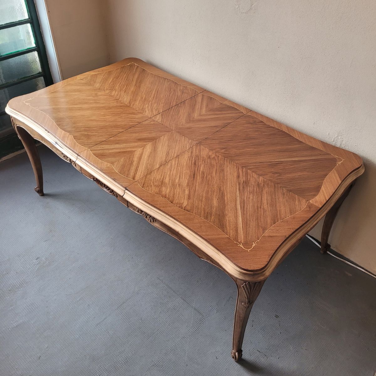 Elegante mesa de comedor estilo Luis XV, realizada en madera con tapa enchapada y delicada marquetería. Presenta patas cabriolé y alargue central, ideal para ampliar su capacidad manteniendo su estilo clásico.