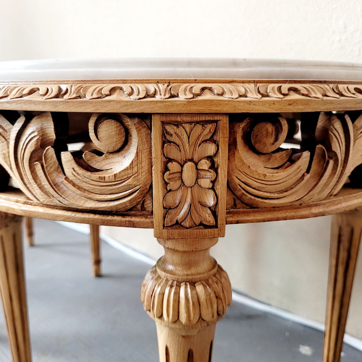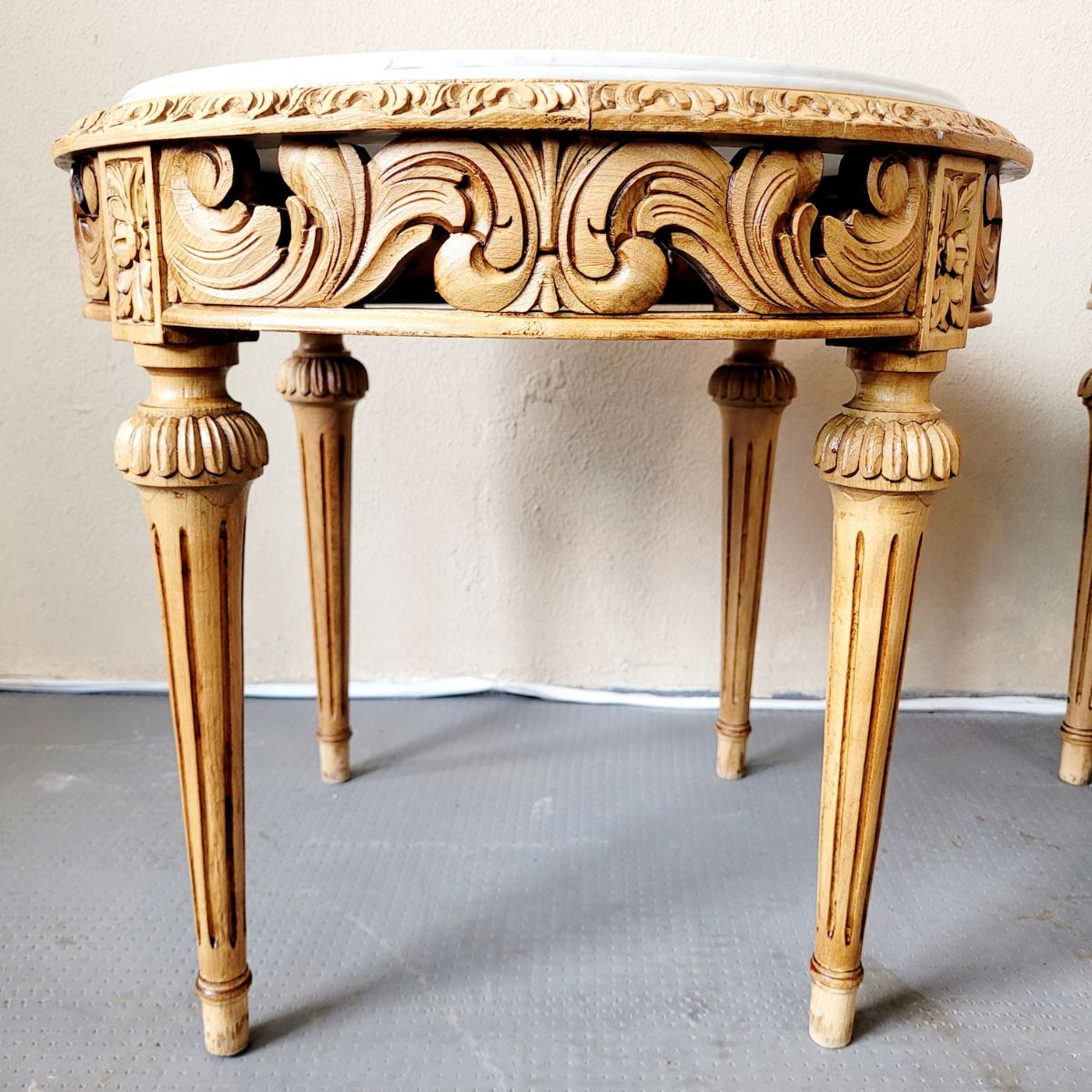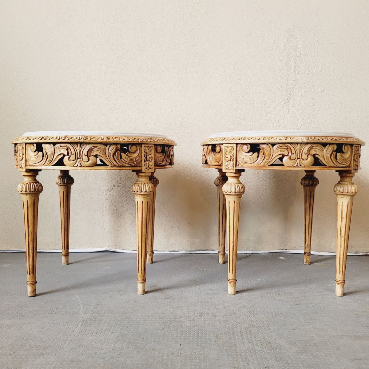 Elegante par de mesitas auxiliares de inspiración francesa, con un diseño refinado y simétrico que destaca por su talla artesanal y líneas clásicas.