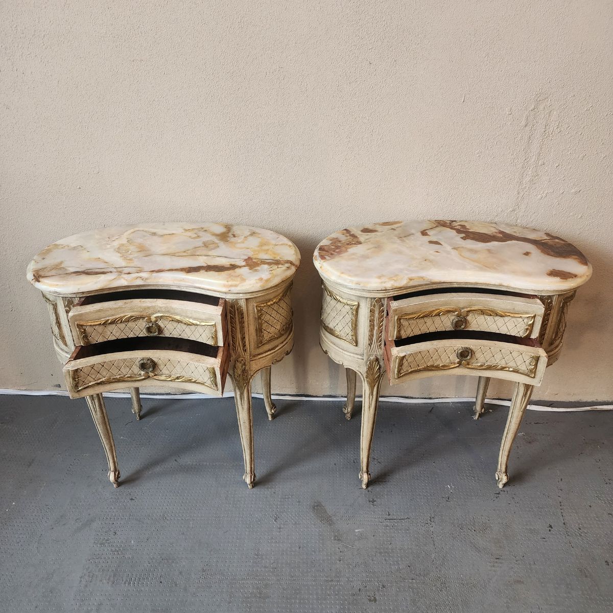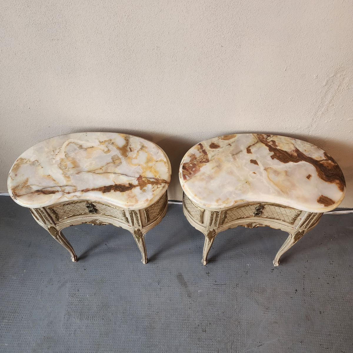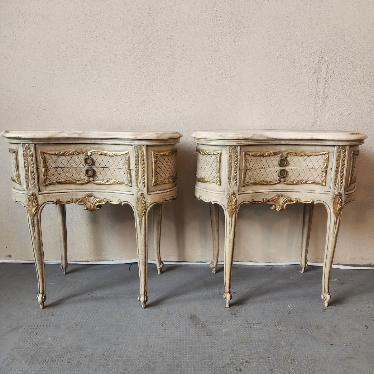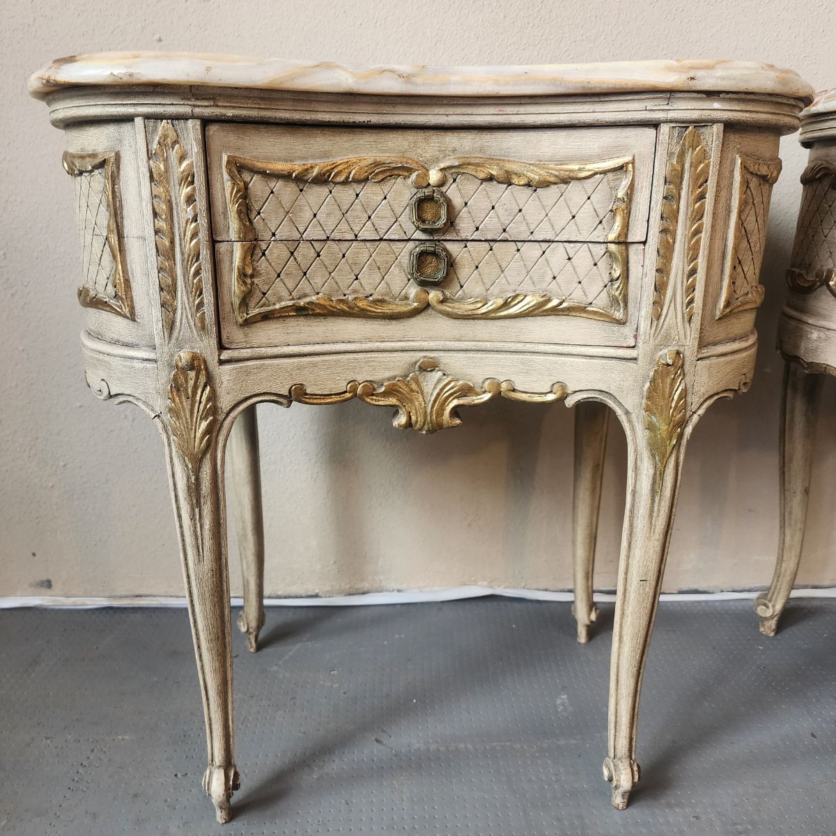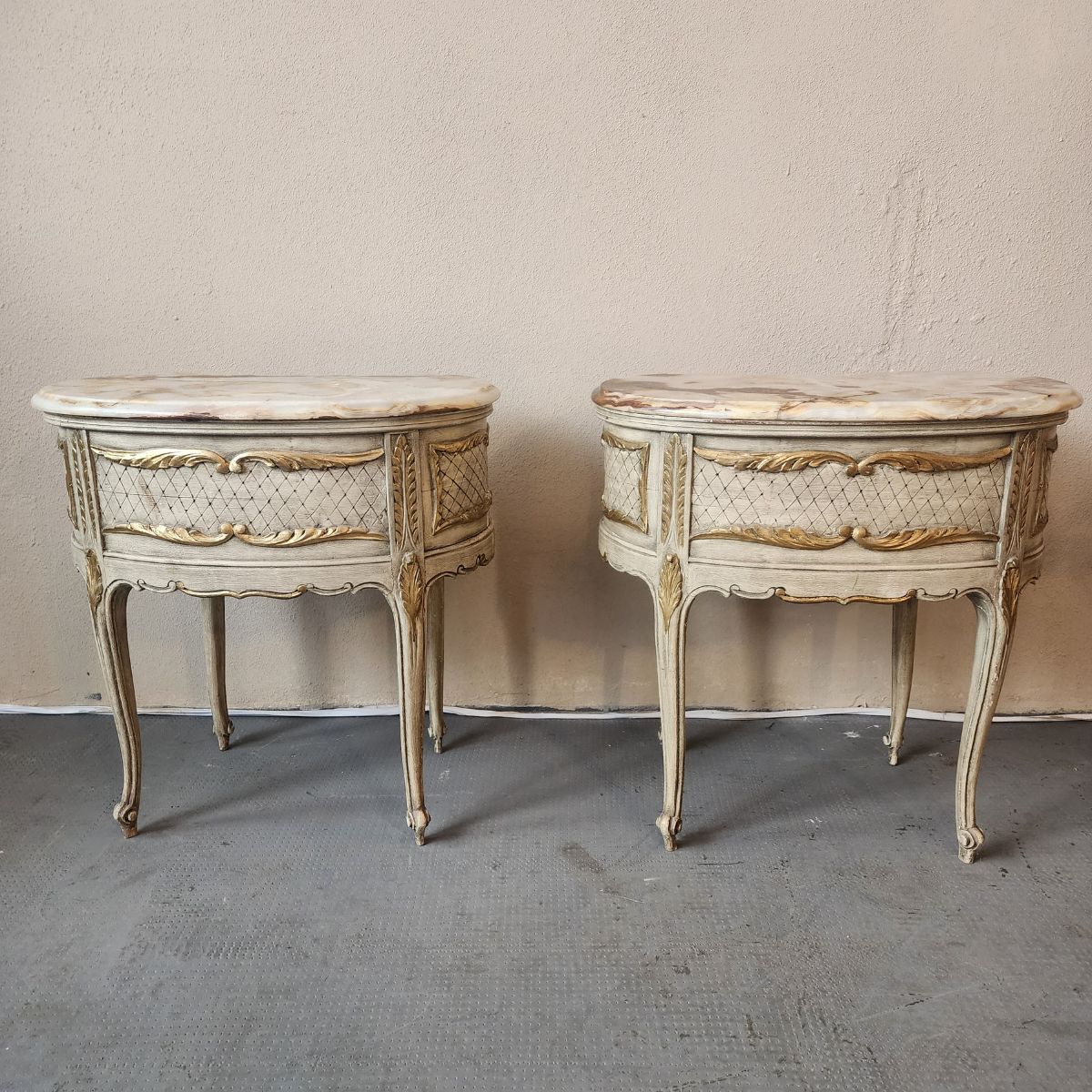 Delicado par de mesas de luz de estilo francés Luis XV, con diseño ovalado y líneas curvas que aportan elegancia. Presentan tapa de mármol veteado y un acabado patinado que realza todos sus detalles.